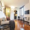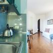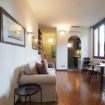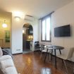 Dall'altro lato, si accede al salotto, un ambiente luminoso e ben arredato, dotato di un comodo divano, una TV a schermo piatto, un tavolino da pranzo e una scrivania richiudibile, perfetta per lavorare da casa.