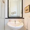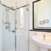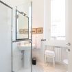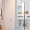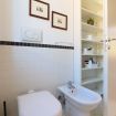 La zona bagno, caratterizzata dal colore bianco, è completa di ogni servizio, quali doccia, lavandino, specchio, toilette e bidet, così come ampie mensole in cui è possibile riporre i propri effetti personali.