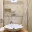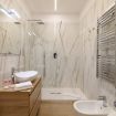 La zona bagno si apre con eleganza grazie ai dettagli in marmo. È completa di lavandino elegante, toilette, bidet, scaldasalviette e rilassante doccia a cascata.