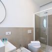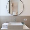 La Zona Bagno offre ogni comfort, quali toilette, bidet e un’ampia doccia a cascata. Lo specchio rotondo completa gli arredi.