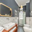 L’elegante zona bagno propone arredi moderni, quali l’alternanza tra classiche piastrelle orizzontali a vista e a forma d’alveare: completa di toilette, bidet, un’ampia e rilassante doccia a cascata e un comodo specchio dotato di luci.
