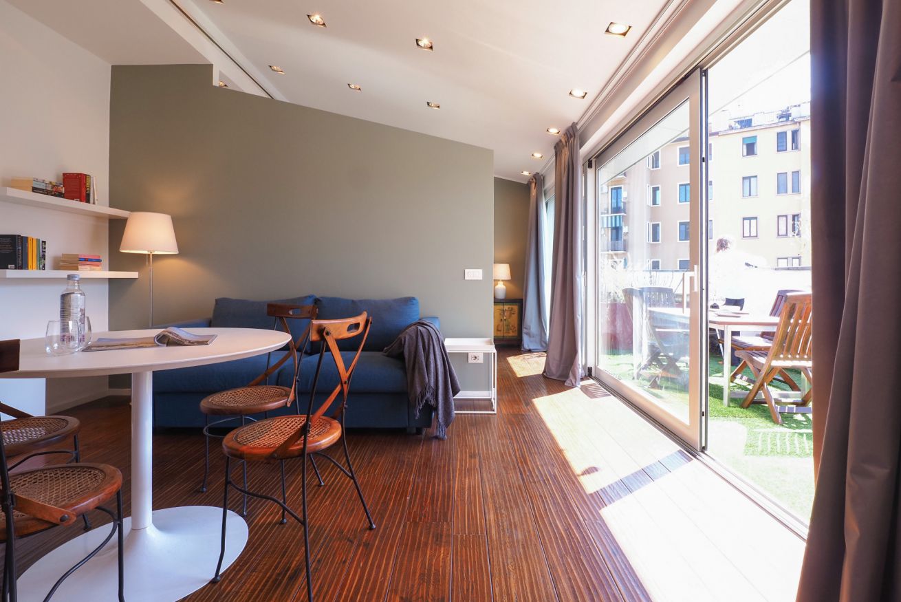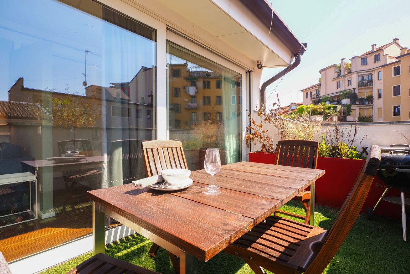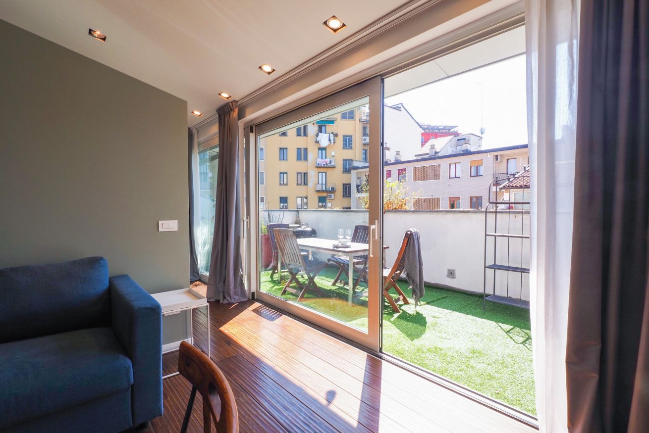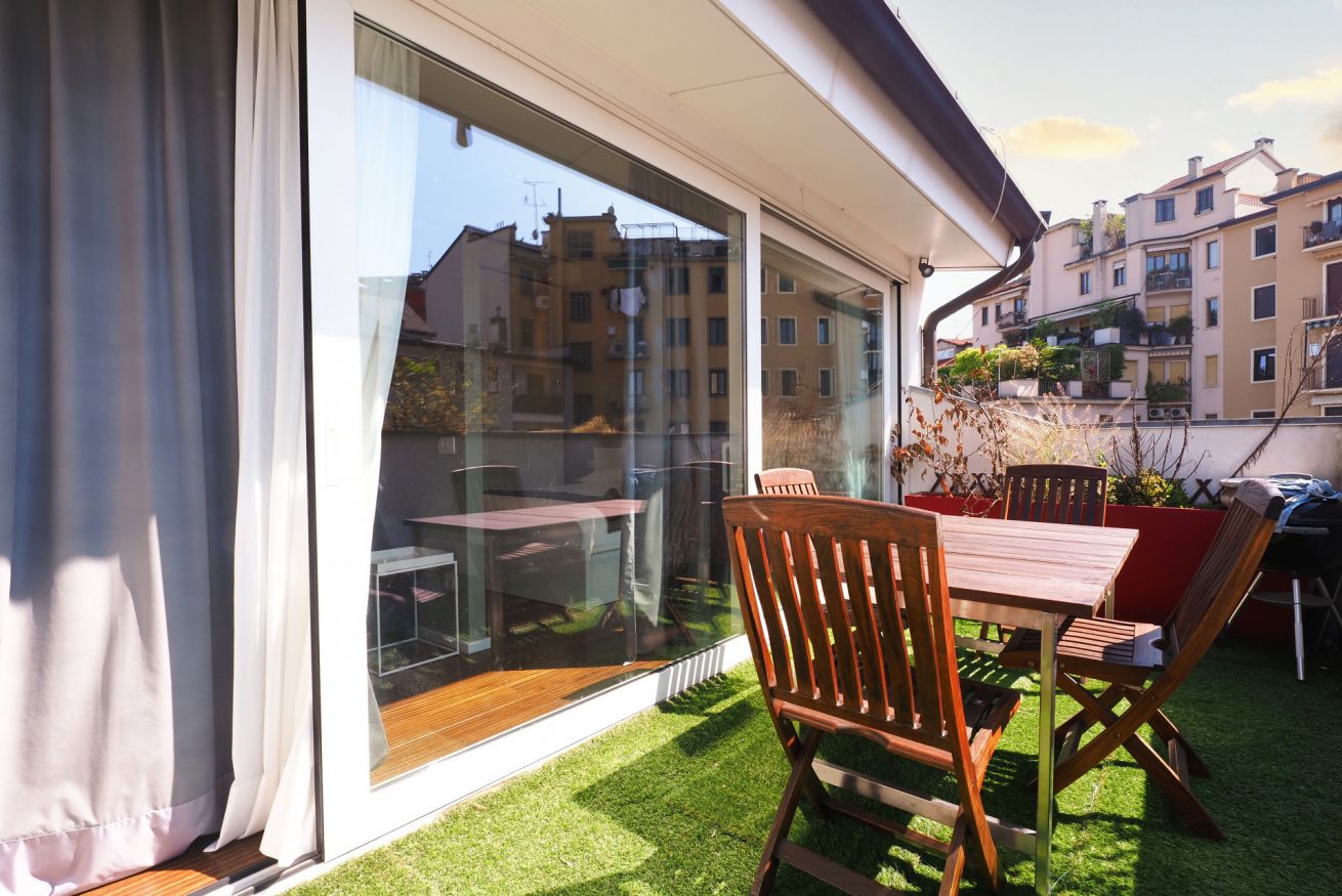 Situato all'ultimo piano di un elegante edificio di quattro piani, l'appartamento si apre su un ingresso caratteristico, accessibile tramite una piccola scalinata che conduce dal pianerottolo all'interno dell'immobile. La cucina moderna è dotata di elettrodomestici all'avanguardia, tra cui forno a microonde, lavastoviglie, piano a induzione e macchina per il caffè, perfetta per preparare deliziosi pasti. Il luminoso salotto è un angolo accogliente, arredato con un tavolo da pranzo rotondo e sedie di design. Qui troverai anche una TV a schermo piatto e un comodo divano trasformabile in letto, ideale per ospitare amici o familiari. La spaziosa camera matrimoniale è inondata di luce naturale e dotata di armadi su misura, offrendo un'ottimale organizzazione per i tuoi effetti personali. Il bagno completo è equipaggiato con wc, bidet e una confortevole doccia, mentre la zona lavanderia aggiunge praticità e funzionalità. Completa questa proprietà un meraviglioso terrazzo attrezzato con un ampio tavolo da pranzo, dove potrai rilassarti e ammirare i suggestivi tetti di Milano, rendendo ogni momento trascorso qui davvero speciale.
