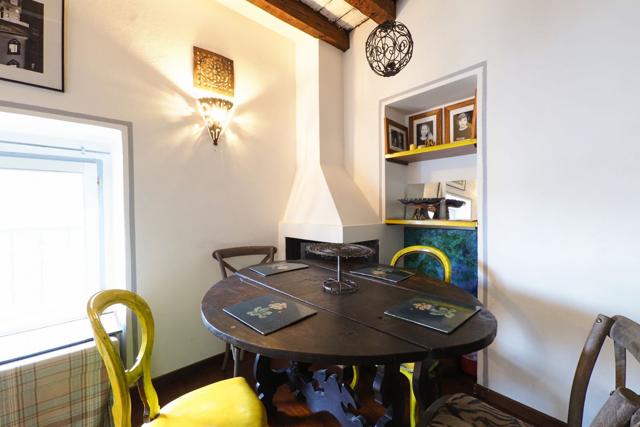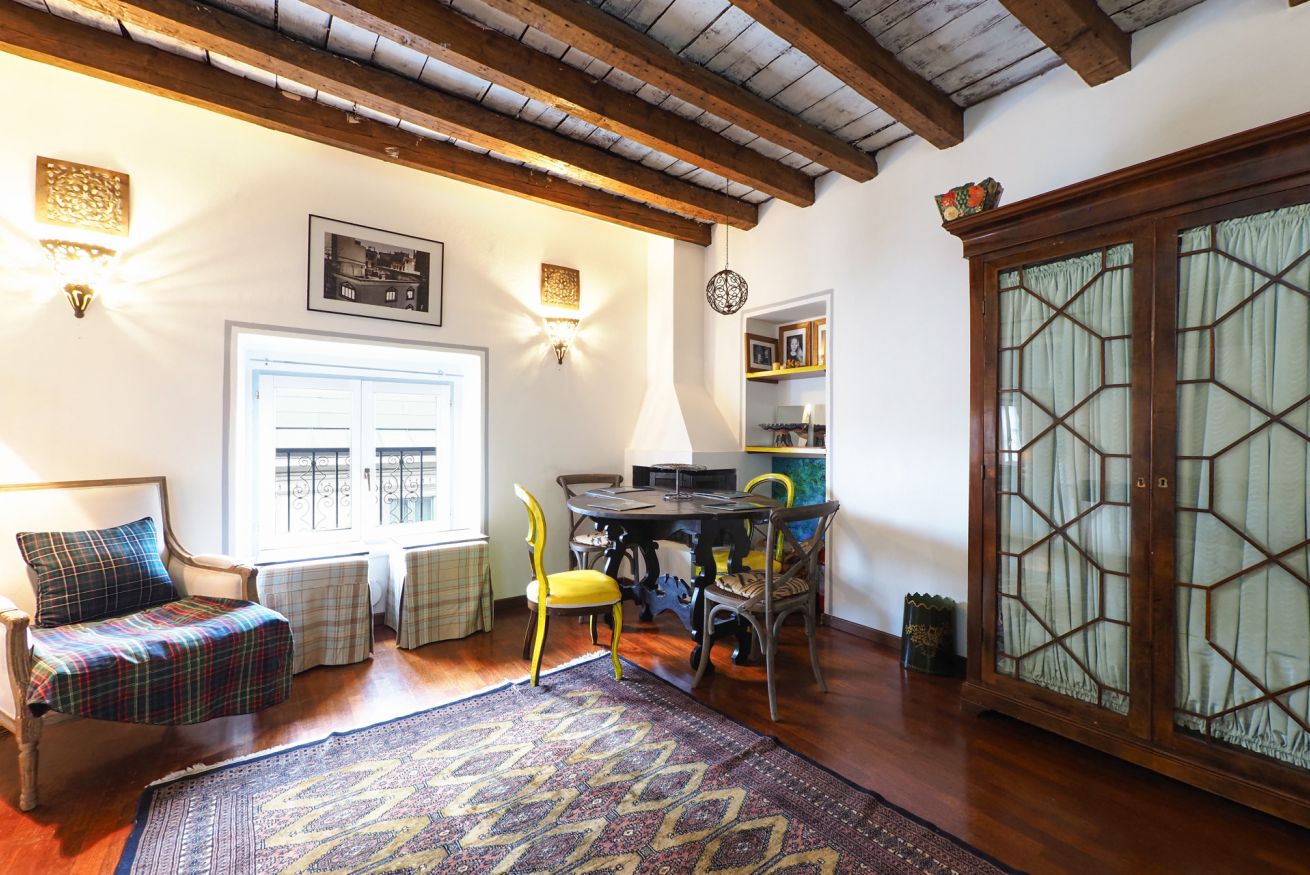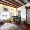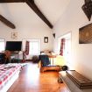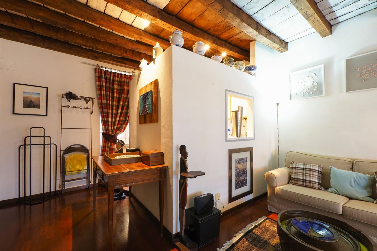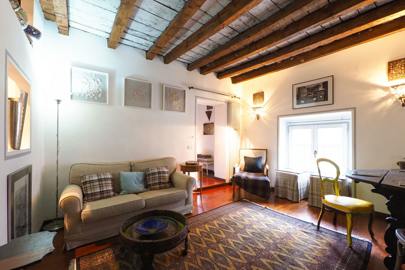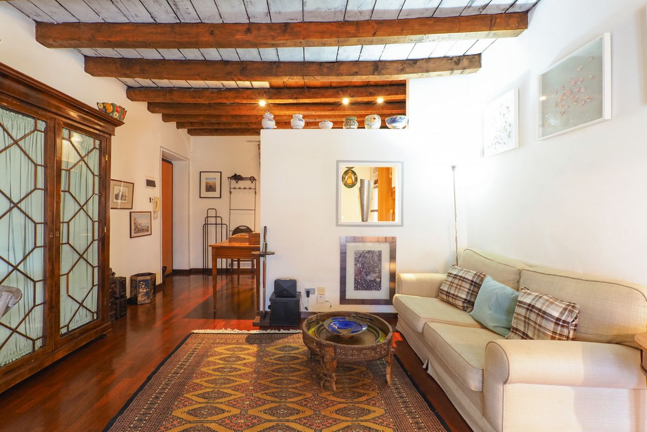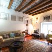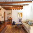 L'appartamento si apre su un accogliente soggiorno caratterizzato da pavimenti in parquet e soffitti con travi a vista, arredato con divano, poltrone, tavolo da pranzo e sedie.