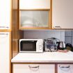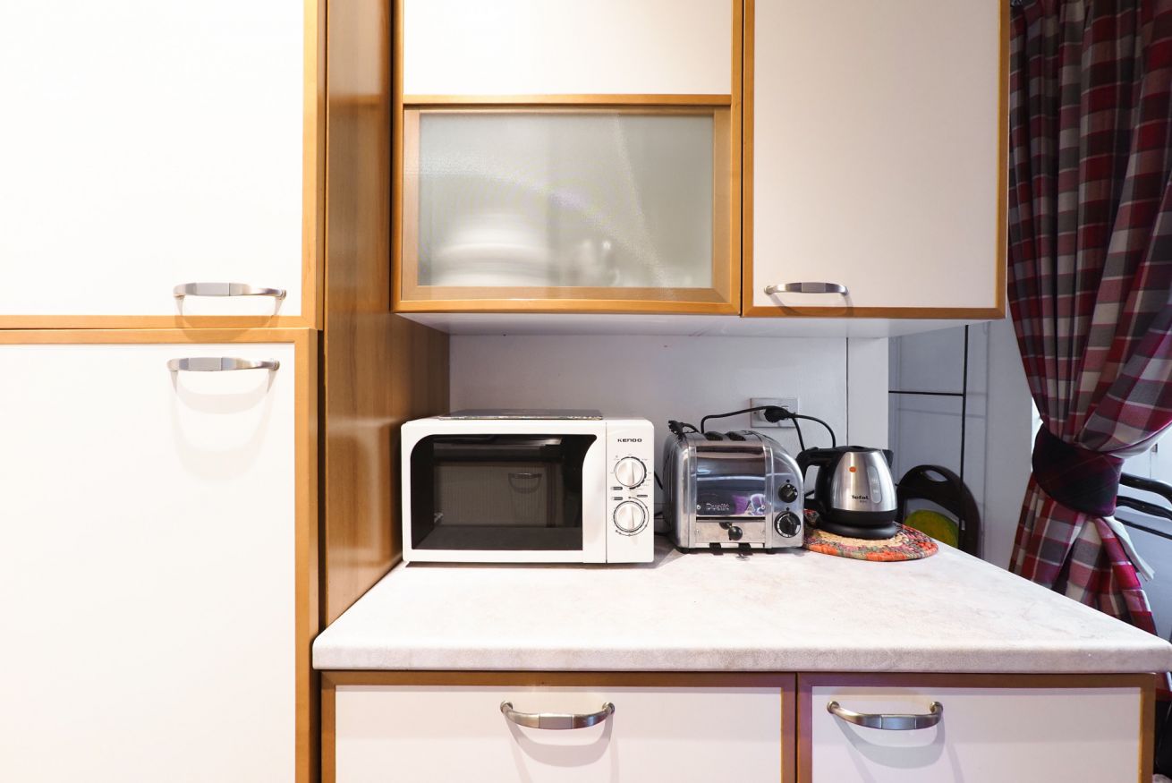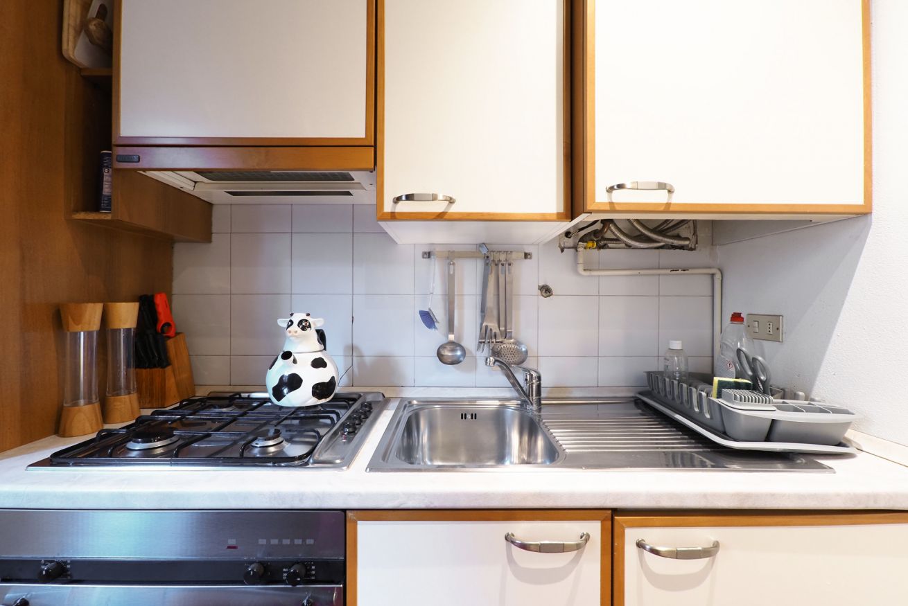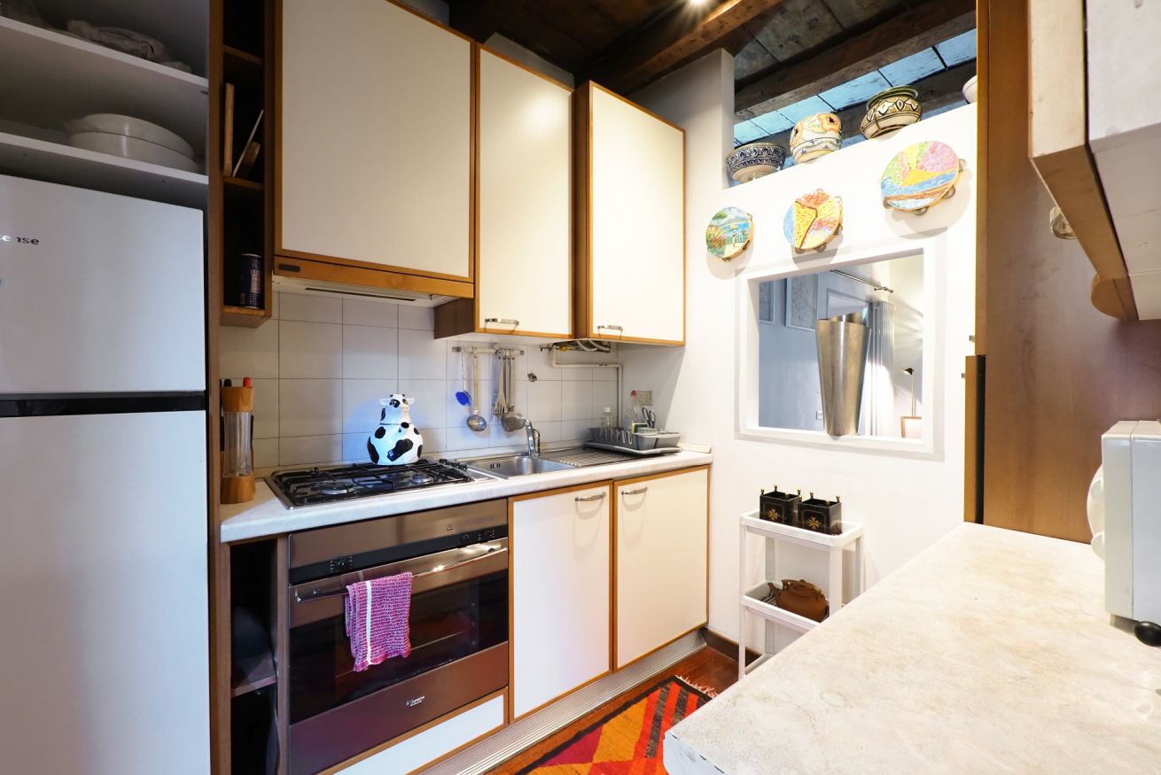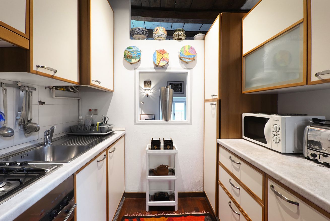 La cucina è sapientemente organizzata e completamente attrezzata, dotata di fornelli a gas, frigorifero, forno tradizionale e microonde, perfetta per preparare deliziosi pasti.