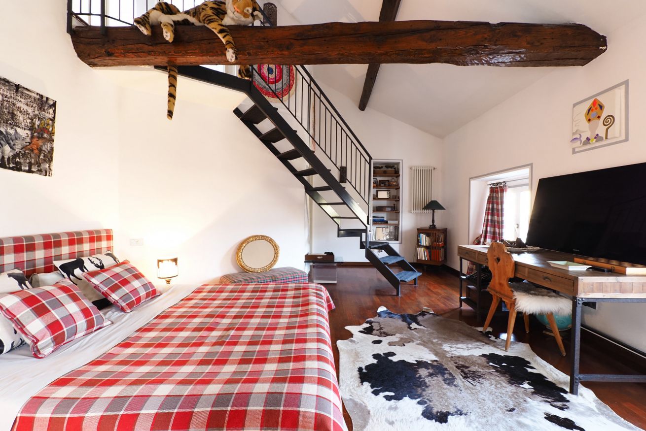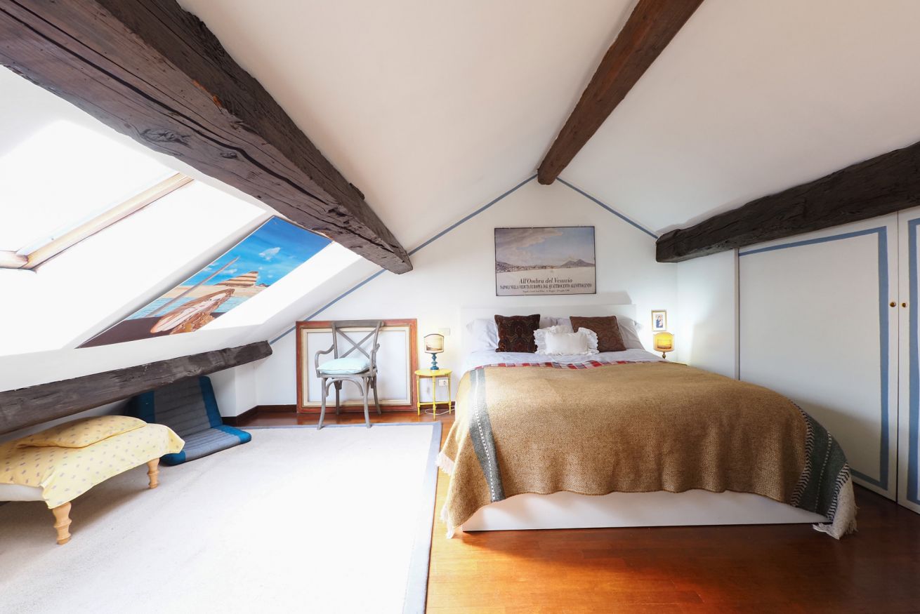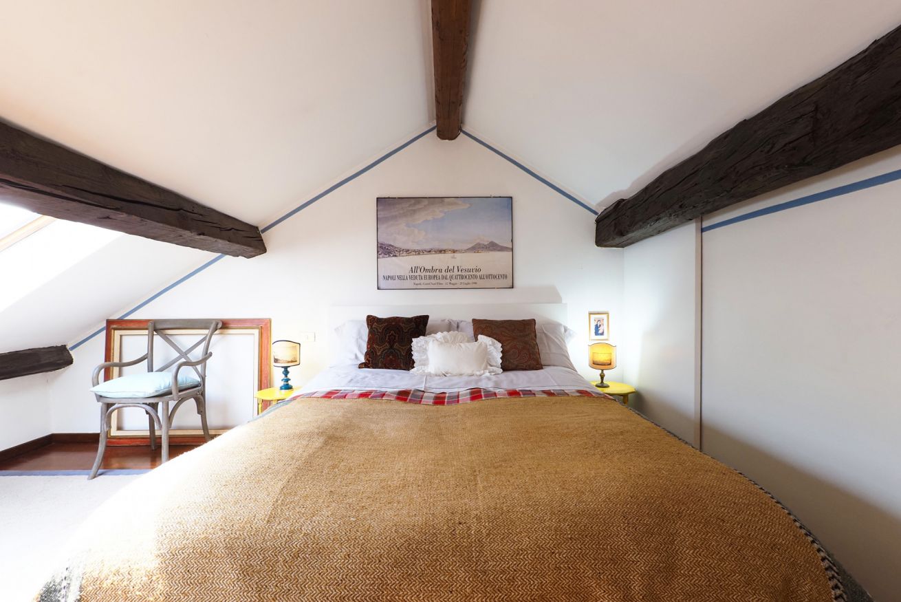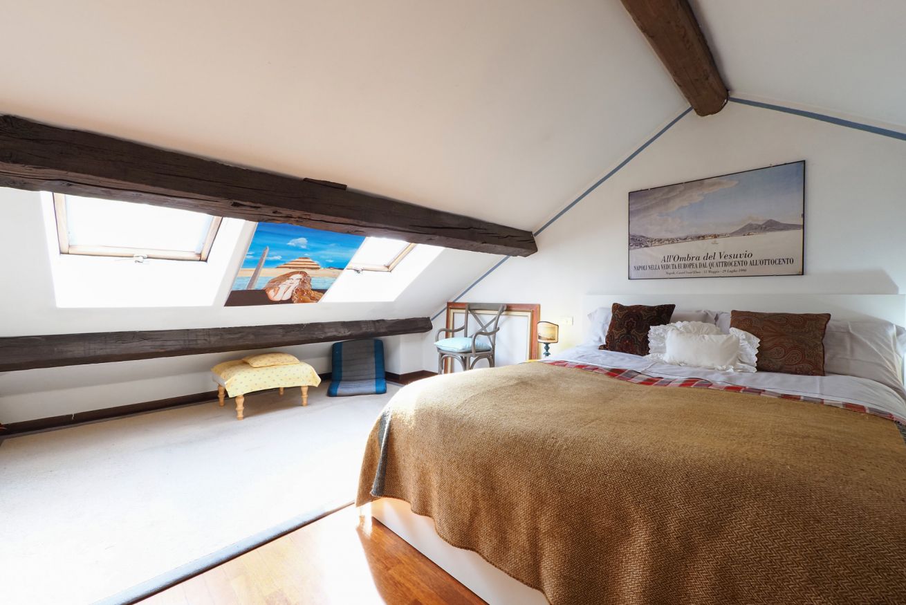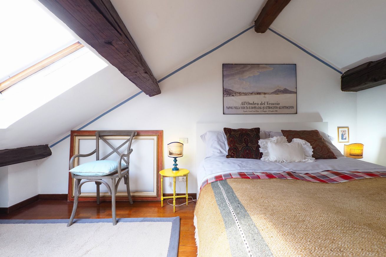 Al secondo livello, si trova una seconda camera con letto matrimoniale, soppalcata e caratterizzata da un tetto spiovente. Questa camera è inondata di luce naturale grazie alle finestre e dispone di un bagno privato con vasca, ideale per momenti di relax dopo una giornata in città.