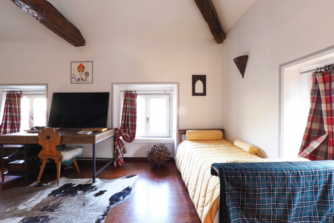 La spaziosa camera principale è molto luminosa, grazie alle ampie finestre, ed è arredata con un letto matrimoniale e un letto singolo.