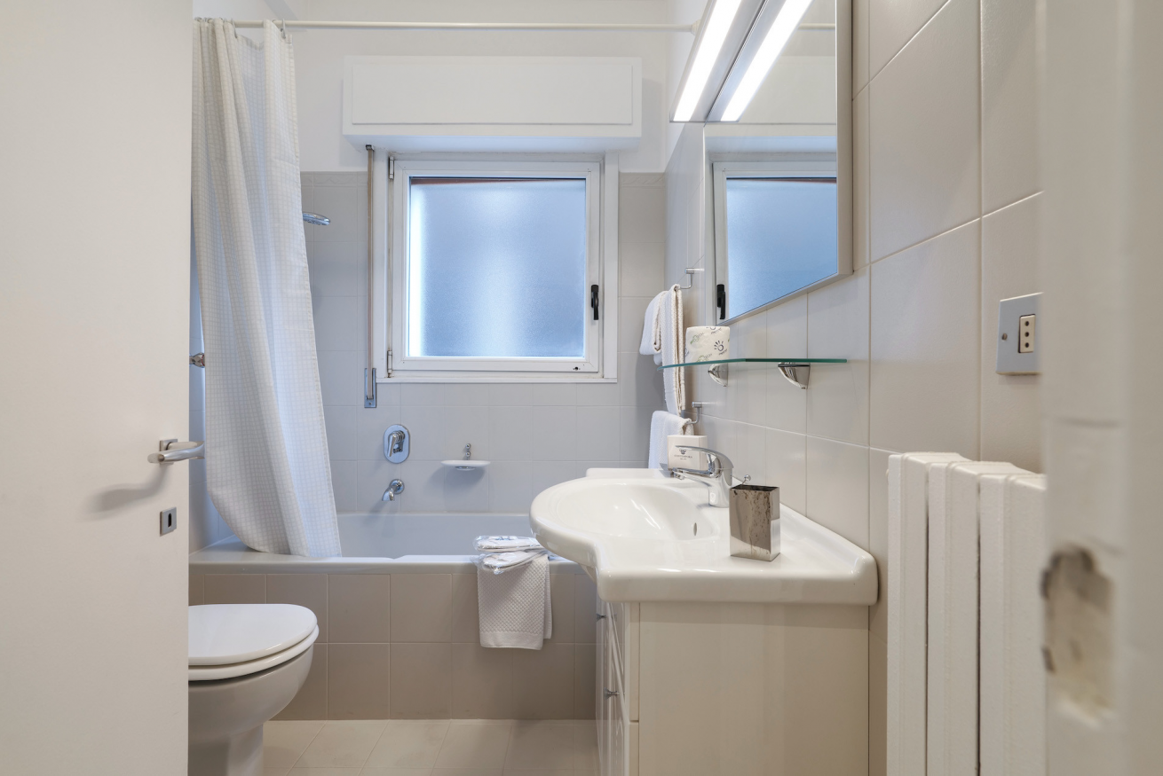 Il bagno, separato dalla camera, è moderno e completo di vasca, WC, bidet e lavabo.