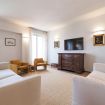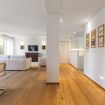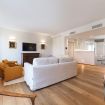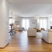 L'appartamento vanta un ampio soggiorno open-space con un bellissimo pavimento in legno, illuminato da tre porte finestre. Qui troverai un'accogliente area salotto con due divani, due poltrone e una grande Smart TV, oltre a una zona pranzo elegante con un tavolo in vetro e una libreria in legno.