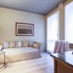 La zona notte è un rifugio di tranquillità, composta da 3 ampie camere equipaggiate con armadi spaziosi, per garantire il massimo comfort durante il vostro soggiorno. Due camere, con pavimento in parquet, la prima con letto matrimoniale, la seconda con due letti singoli, mentre la terza, con pavimento in marmo, ha un letto singolo. Quest'ultima camera si trasforma anche in uno studio ideale, grazie a una storica scrivania in legno e una porta finestra che si apre sul balcone, perfetta per chi lavora da remoto.