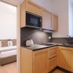Il bilocale propone una zona living, composta da un confortevole divano TV a schermo piatto, tavolo da pranzo a 4 posti e un'elegante cucina, completa di frigorifero, freezer, piano induzione, stoviglie, forno tradizionale e forno a microonde. La zona notte propone un comodo letto matrimoniale e ampi armadi. La zona bagno è completa di ogni comfort, come specchio, lavandino, toilette, bidet e un’elegante doccia.